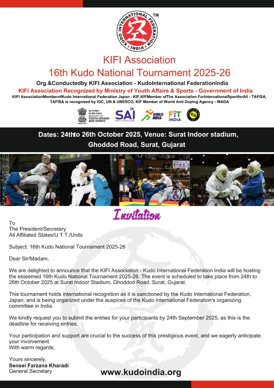 Surat Indoor Stadium Surat Indoor Stadium, SuratThe KIFI Association – Kudo International Federation India is proud to host the prestigious 16th Kudo National Tournament 2025–26, scheduled to take place from 24th to 26th October 2025 at the Surat Indoor Stadium, Ghoddod Road, Surat, Gujarat. This nationally recognized event is sanctioned by the Kudo International Federation, Japan, and organized under the auspices